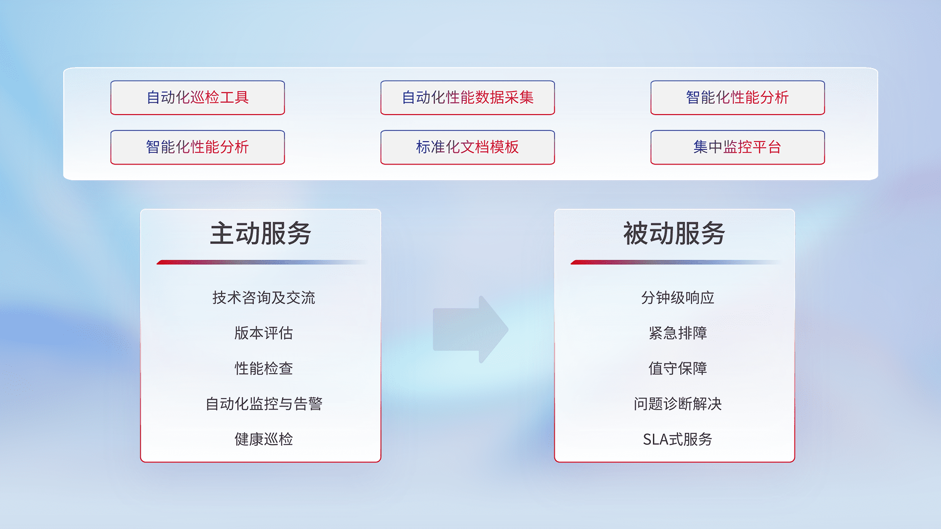 智能化工具和标准化文档,,,,保障服务质量,,,提供主动服务(包含技术咨询、、、版本评估、、、、性能检查、、、、自动化监控与告警、、、健康巡检)和被动服务包含(分钟级响应、、紧急排障、、、值守保障、、、、问题诊断解决、、、SLA服务)。。。。